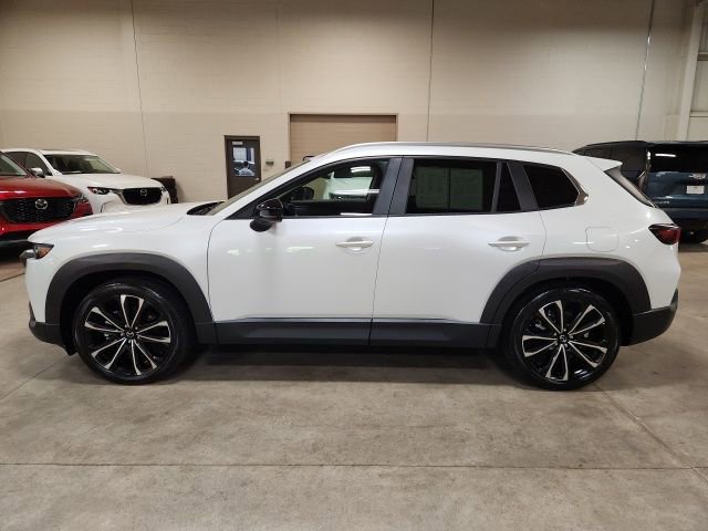 CARFAX One-Owner. Certified. Pearl 2024 Mazda CX-50 2.5 Turbo AWD 6-Speed Automatic 2.5L I4 Turbocharged DOHC 16V LEV3-ULEV70 227hp **ONE OWNER**, ** LOW MILES**, **MAZDA CERTIFIED**, Mazda Certified Pre-Owned Certified, 20" x 8J Aluminum Alloy Wheels, 3.841 Axle Ratio, 4-Wheel Disc Brakes, 8 Speakers, ABS brakes, Air Conditioning, Alloy wheels, AM/FM radio, AppLink/Apple CarPlay and Android Auto, Auto High-beam Headlights, Auto-dimming Rear-View mirror, Automatic temperature control, Brake assist, Bumpers: body-color, Compass, Delay-off headlights, Driver door bin, Driver vanity mirror, Dual front impact airbags, Dual front side impact airbags, Electronic Stability Control, Emergency communication system: MAZDA CONNECT, Exterior Parking Camera Rear, Front anti-roll bar, Front Bucket Seats, Front Center Armrest, Front dual zone A/C, Front reading lights, Front wheel independent suspension, Fully automatic headlights, Garage door transmitter: HomeLink, Heated door mirrors, Heated Front Bucket Seats, Heated front seats, Illuminated entry, Knee airbag, Leather Seat Trim, Leather Shift Knob, Leather steering wheel, Low tire pressure warning, Memory seat, Occupant sensing airbag, Outside temperature display, Overhead airbag, Overhead console, Panic alarm, Passenger door bin, Passenger vanity mirror, Power door mirrors, Power driver seat, Power Liftgate, Power moonroof, Power passenger seat, Power steering, Power windows, Premium Carpet Floor Mats, Radio data system, Radio: AM/FM/HD Audio System, Rain sensing wipers, Rear seat center armrest, Rear window defroster, Rear window wiper, Remote keyless entry, Retractable Cargo Cover, Speed control, Speed-sensing steering, Split folding rear seat, Spoiler, Steering wheel mounted audio controls, Tachometer, Telescoping steering wheel, Tilt steering wheel, Traction control, Trailer Hitch w/7-Pin Harness, Trip computer, Turn signal indicator mirrors, Variably intermittent wipers, Wind Chill Pearl Paint Charge.