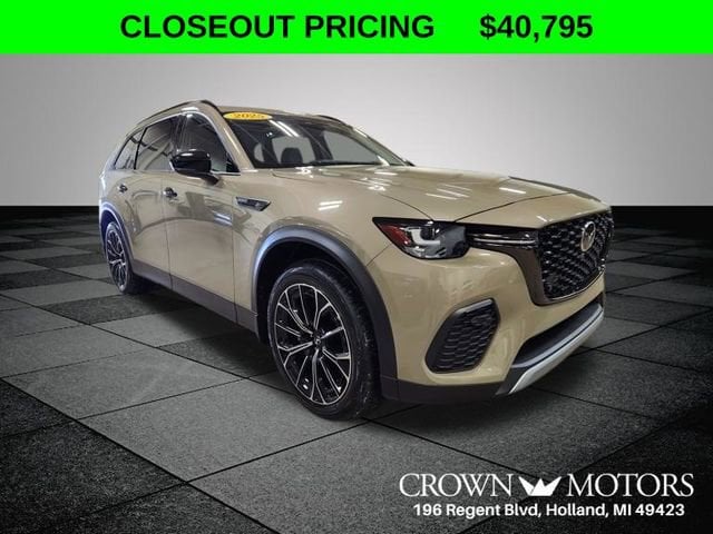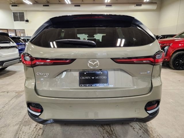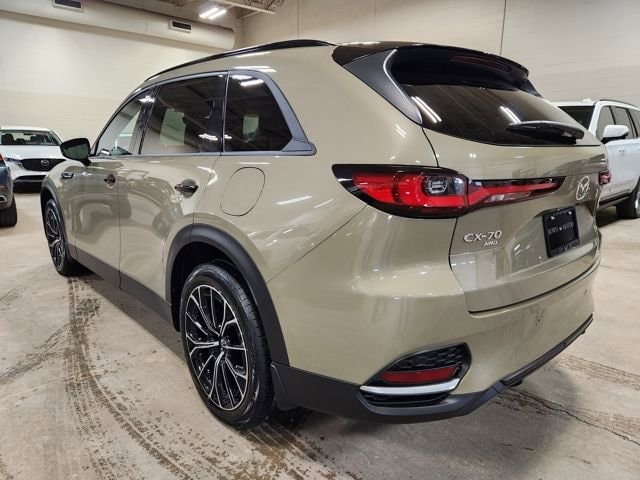 CARFAX One-Owner. Clean CARFAX. Certified. Zircon Sand Metallic 2025 Mazda CX-70 PHEV Premium AWD 8-Speed Automatic 2.5L I4 DOHC 16V LEV3-SULEV30 Mazda Certified Pre-Owned Certified, 12 Speakers, 4-Wheel Disc Brakes, ABS brakes, Air Conditioning, All-Weather Floor Mats, Alloy wheels, AM/FM radio: SiriusXM, Auto High-beam Headlights, Auto-dimming Rear-View mirror, Automatic temperature control, Brake assist, Bumpers: body-color, Compass, Delay-off headlights, Driver door bin, Driver vanity mirror, Dual front impact airbags, Dual front side impact airbags, E911 Automatic Emergency Notification, Electronic Stability Control, Emergency communication system: MAZDA CONNECT, Exterior Parking Camera Rear, Four wheel independent suspension, Front & Rear Splash Guards, Front anti-roll bar, Front Bucket Seats, Front Center Armrest w/Storage, Front dual zone A/C, Front reading lights, Fully automatic headlights, Garage door transmitter: HomeLink, Heads-Up Display, Heated door mirrors, Heated Front Bucket Seats, Heated front seats, Illuminated entry, Infotainment System Voice Command, Knee airbag, Leather Seat Trim, Leather Shift Knob, Leather steering wheel, Low tire pressure warning, Mazda Connected Services, Mazda Online Navigation, Memory seat, Navigation system: MAZDA CONNECT, Occupant sensing airbag, Outside temperature display, Overhead airbag, Overhead console, Padded Cargo Liner, Pandora Internet Radio Integration, Panic alarm, Passenger door bin, Passenger vanity mirror, Power door mirrors, Power driver seat, Power Liftgate, Power moonroof, Power passenger seat, Power steering, Power windows, Radio Broadcast Data System Program Information, Radio data system, Radio: AM/FM w/Bose Premium Audio Sound System, Rain sensing wipers, Rear air conditioning, Rear anti-roll bar, Rear reading lights, Rear seat center armrest, Rear window defroster, Rear window wiper, Remote keyless entry, SMS Text Msg Audio Delivery & Reply, Speed control, Speed-sensing steering, Split folding rear seat, Spoiler, Steering wheel mounted audio controls, Tachometer, Telescoping steering wheel, Tilt steering wheel, Traction control, Trip computer, Turn signal indicator mirrors, Variably intermittent wipers, Wheels: 21" x 9.5J Aluminum Alloy, Zircon Sand Metallic Paint Charge.