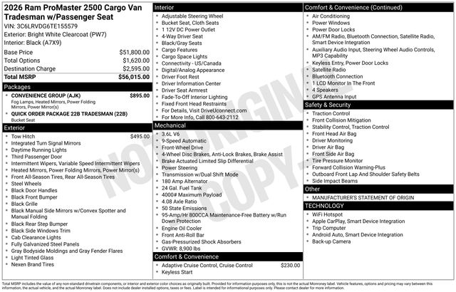Experience the ultimate in functionality and convenience with the 2026 Ram ProMaster 2500 High Roof. Visit our showroom today and let our knowledgeable team help you discover the perfect vehicle to elevate your driving experience. Price includes: $4000 - 2026 National Bonus Cash