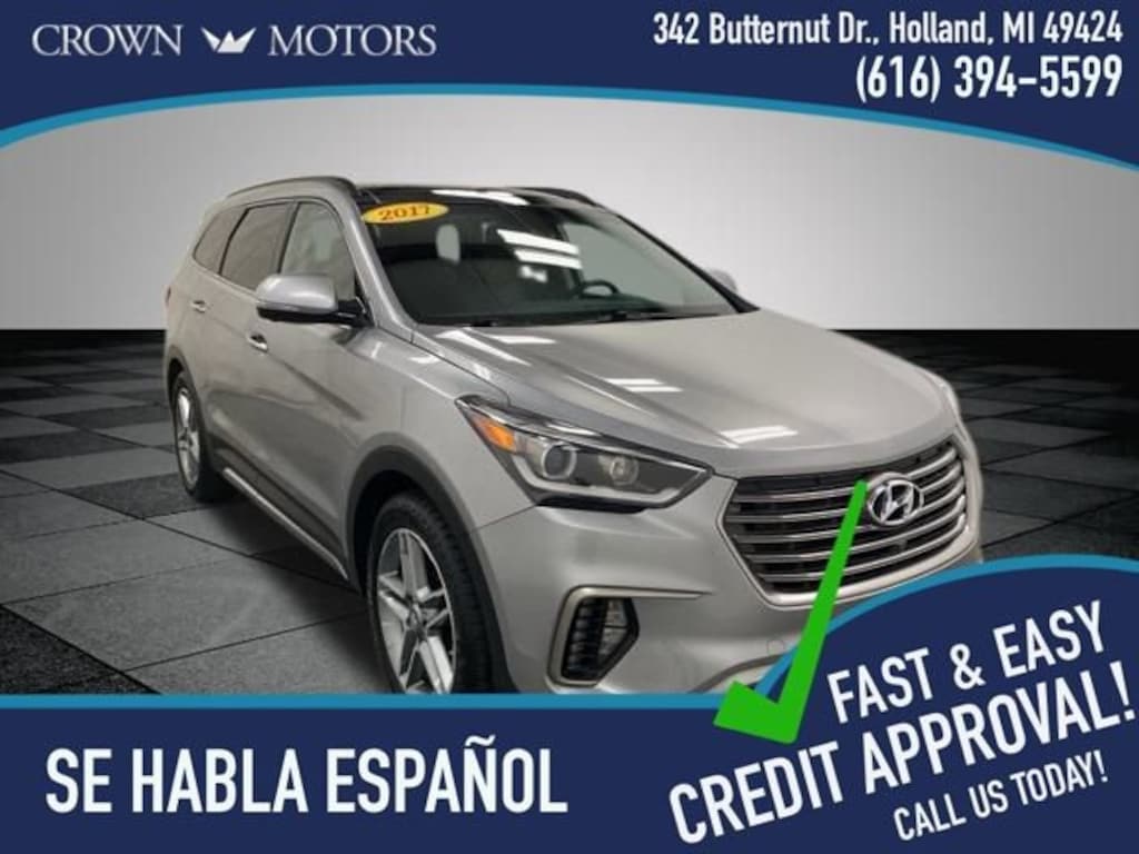 Clean CARFAX. Iron Frost 2017 Hyundai Santa Fe Limited Ultimate AWD 6-Speed Automatic with Shiftronic 3.3L V6 DGI DOHC 24V **ACCIDENT FREE**, **LOCAL TRADE IN**, AWD, Gray Leather, 12 Speakers, 19" x 7.5J Aluminum Alloy Wheels, 3.041 Axle Ratio, 3rd row seats: split-bench, 4-Wheel Disc Brakes, ABS brakes, Air Conditioning, All Weather Floor Mats, Alloy wheels, AM/FM radio: SiriusXM, Android Auto, Auto-dimming Rear-View mirror, Automatic Emergency Braking, Automatic temperature control, Brake assist, Bumper Applique, Bumpers: body-color, Cargo Cover, Cargo Net, Cargo Tray, CD player, Compass, Delay-off headlights, Driver door bin, Driver vanity mirror, Dual front impact airbags, Dual front side impact airbags, Dynamic Bending Light, Electronic Parking Brake, Electronic Stability Control, Emergency communication system: Blue Link, Exterior Parking Camera Rear, First Aid Kit, Four wheel independent suspension, Front anti-roll bar, Front Bucket Seats, Front Center Armrest, Front dual zone A/C, Front fog lights, Front reading lights, Fully automatic headlights, Garage door transmitter: HomeLink, Heated & Ventilated Multi-Adjustable Bucket Seats, Heated door mirrors, Heated front seats, Heated rear seats, Heated steering wheel, High Beam Assist, High-Intensity Discharge Headlamps, Illuminated entry, Knee airbag, Lane Departure Warning System, Leather Seating Surfaces, Leather steering wheel, Limited Ultimate Tech Package 04, Low tire pressure warning, Memory seat, Navigation System, Occupant sensing airbag, Option Group 04, Outside temperature display, Overhead airbag, Overhead console, Panic alarm, Passenger door bin, Passenger vanity mirror, Power door mirrors, Power driver seat, Power Liftgate, Power moonroof, Power passenger seat, Power steering, Power windows, Radio: AM/FM/SiriusXM/CD/HD/MP3 w/Navigation, Rear air conditioning, Rear anti-roll bar, Rear Parking Sensors, Rear window defroster, Rear window wiper, Remote keyless entry, Roof rack: rails only, Security system, Smart Cruise Control, Speed control, Speed-sensing steering, Split folding rear seat, Spoiler, Steering wheel mounted audio controls, Tachometer, Telescoping steering wheel, Tilt steering wheel, Traction control, Trip computer, Turn signal indicator mirrors, Variably intermittent wipers, Ventilated front seats, Wheel Locks, AWD, Gray Leather.