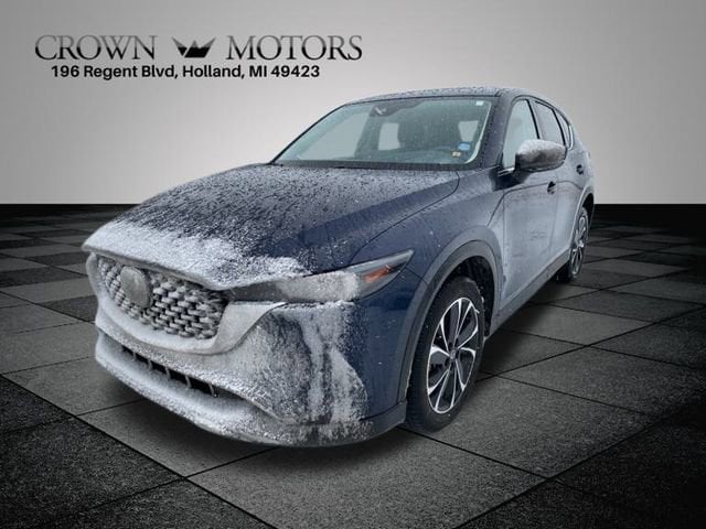 Clean CARFAX. Deep Crystal Blue Mica 2022 Mazda CX-5 2.5 S Premium Package AWD 6-Speed Automatic SKYACTIV® 2.5L 4-Cylinder DOHC 16V 4-Wheel Disc Brakes, 4.624 Axle Ratio, 6 Speakers, ABS brakes, Air Conditioning, Alloy wheels, AppLink/Apple CarPlay and Android Auto, Auto High-beam Headlights, Auto-dimming Rear-View mirror, Automatic temperature control, Bose Audio Credit, Brake assist, Bumpers: body-color, Cargo Mat, Delay-off headlights, Driver door bin, Driver vanity mirror, Dual front impact airbags, Dual front side impact airbags, E911 Automatic Emergency Notification, Electronic Stability Control, Emergency communication system: MAZDA CONNECT, Exterior Parking Camera Rear, Four wheel independent suspension, Front anti-roll bar, Front Bucket Seats, Front Center Armrest w/Storage, Front dual zone A/C, Front reading lights, Fully automatic headlights, Garage door transmitter: HomeLink, Heated door mirrors, Heated Front Bucket Seats, Heated front seats, Illuminated entry, Infotainment System Voice Command, Leather Seat Trim, Leather Shift Knob, Low tire pressure warning, Memory seat, Multifunction Commander Control, Occupant sensing airbag, Outside temperature display, Overhead airbag, Overhead console, Pandora, Panic alarm, Passenger door bin, Passenger vanity mirror, Power door mirrors, Power driver seat, Power Liftgate Credit, Power moonroof, Power passenger seat, Power steering, Power windows, Premium audio system: Bose, Radio Broadcast Data System Program Information, Radio data system, Radio: AM/FM/HD Audio System, Rain sensing wipers, Rear anti-roll bar, Rear reading lights, Rear seat center armrest, Rear window defroster, Rear window wiper, Remote keyless entry, SMS Text Msg Audio Delivery & Reply, Speed control, Speed-sensing steering, Split folding rear seat, Spoiler, Steering wheel mounted audio controls, Tachometer, Telescoping steering wheel, Tilt steering wheel, Traction control, Trip computer, Turn signal indicator mirrors, Variably intermittent wipers, Wheels: 19" x 7J Aluminum Alloy.