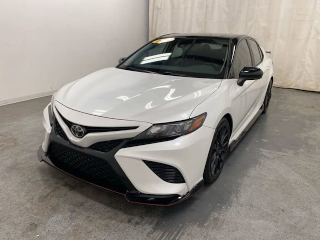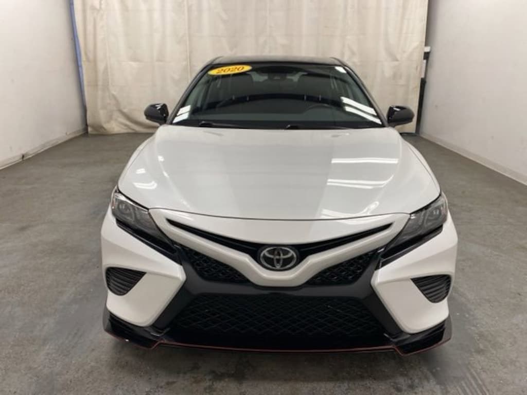 CARFAX One-Owner. Wind Chill Pearl 2020 Toyota Camry TRD V6 FWD 8-Speed Automatic 3.5L V6 DOHC 24V **LOCAL TRADE IN**, Black/Red Cloth, 4-Wheel Disc Brakes, 6 Speakers, ABS brakes, Air Conditioning, Alloy wheels, AM/FM radio: SiriusXM, Apple CarPlay/Android Auto, Auto High-beam Headlights, Auto-dimming Rear-View mirror, Automatic temperature control, Brake assist, Bumpers: body-color, Compass, Delay-off headlights, Driver door bin, Driver vanity mirror, Dual front impact airbags, Dual front side impact airbags, Electronic Stability Control, Emergency communication system: Safety Connect with 1-year trial, Exterior Parking Camera Rear, Fabric Seat Trim w/SofTex, Four wheel independent suspension, Front anti-roll bar, Front Bucket Seats, Front Center Armrest, Front dual zone A/C, Front reading lights, Front Sport Bucket Seats, Fully automatic headlights, Heated door mirrors, Illuminated entry, Knee airbag, Leather Shift Knob, Low tire pressure warning, Occupant sensing airbag, Outside temperature display, Overhead airbag, Overhead console, Panic alarm, Passenger door bin, Passenger vanity mirror, Power door mirrors, Power driver seat, Power steering, Power windows, Radio data system, Radio: AM/FM Audio System, Rear anti-roll bar, Rear reading lights, Rear seat center armrest, Rear side impact airbag, Rear window defroster, Remote keyless entry, Security system, Speed control, Speed-sensing steering, Split folding rear seat, Spoiler, Sport steering wheel, Steering wheel mounted audio controls, Tachometer, Telescoping steering wheel, Tilt steering wheel, Traction control, TRD Bumper, TRD LED Low Headlamp, TRD Luggage Door, TRD Rear Spoiler, Trip computer, Turn signal indicator mirrors, Variably intermittent wipers, Wheels: 8.5J x 19" TRD Matte Black Alloy, Black/Red Cloth.